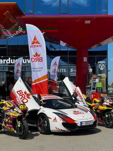 Keliamės į mūsų partnerių “Stateta” degalinę, kur filmavome trumpą filmuką. Ten mus jau pasitiko Benediktas Čirba - Aros Marine Drift – drifto profesionalas, ir išskirtinis „Stateta Bro“ McLaren automobilis. Per neilgą laiką nufilmavome daug vertingos medžiagos, pasimėgavome kava, ir vėl leidomės atgal į Kačerginę. Ten mūsų laukė dar dvi sesijos ir „Track Day“ varžybos. Dėkojame BCRC - Baltic Circuit Racing