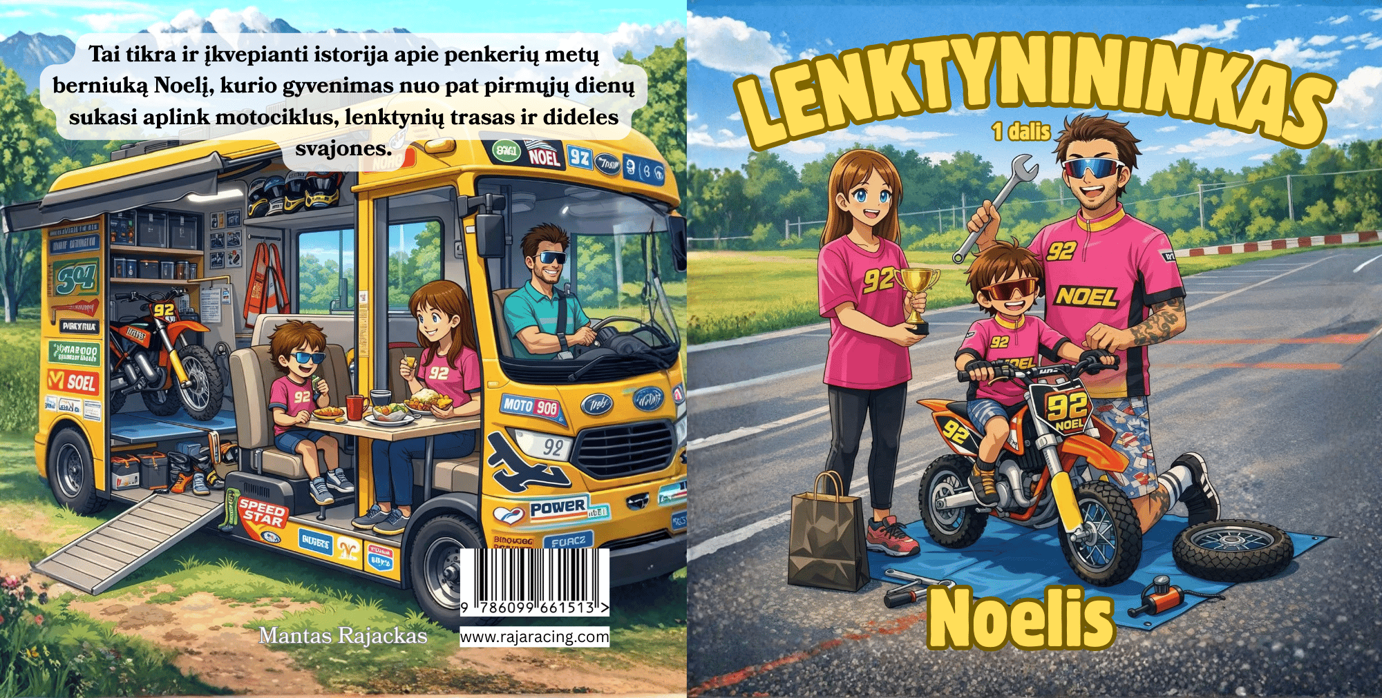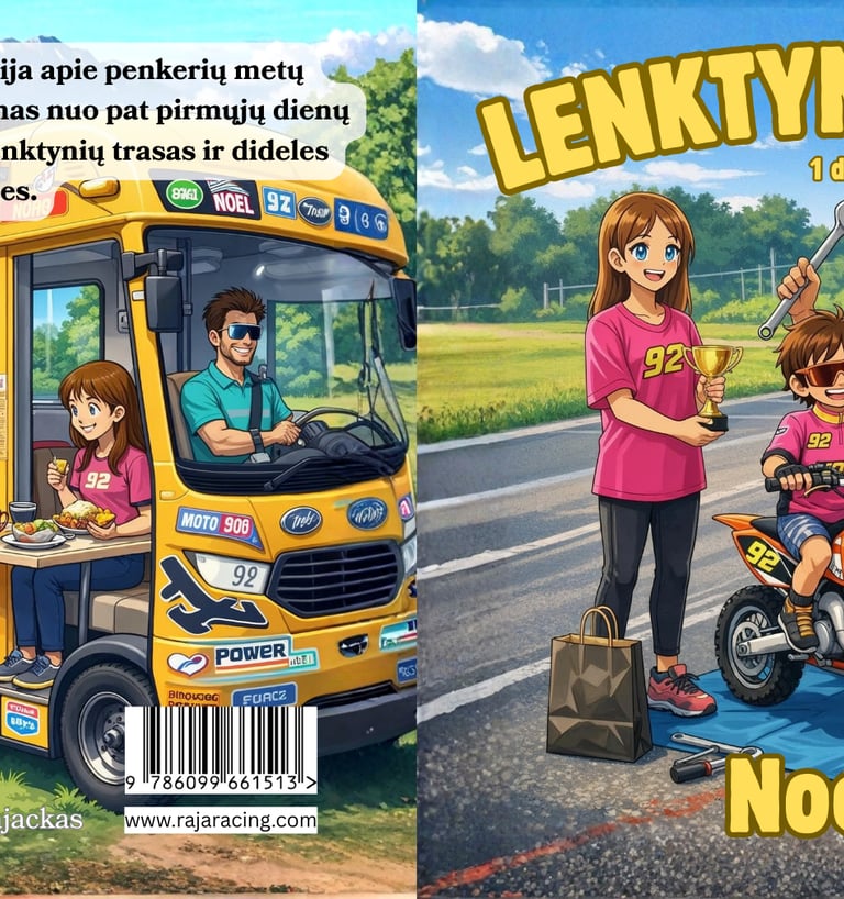 Šioje pirmojoje knygų serijos dalyje mažasis skaitytojas kartu su Noeliu leidžiasi į nuotykį, kupiną greičio, jaudulio, baimių ir drąsos. Tai pasakojimas apie vaiką, kuris augo šalia profesionalaus motociklų lenktynininko tėčio, keliavo po Lietuvą ir Europą, gyveno name ant ratų, mokėsi nenuleisti rankų ir tikėti savimi.